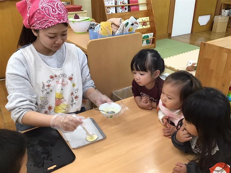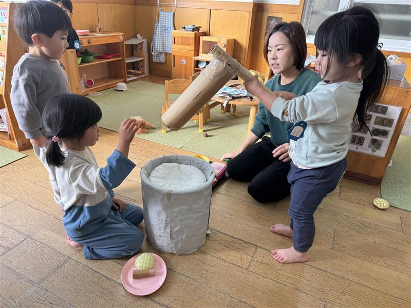お部屋の中では、ままごとや絵本、積木、パズルなどから好きな遊びを自分で選んで遊んだり、先生とわらべ唄を歌ったり、色々なものに見て、触れて、感じて、発見して、楽しんでいます。